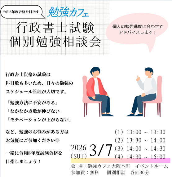 3/7(土)【本町】令和8年度合格を目指す 行政書士試験個別勉強相談会(会員様限定)