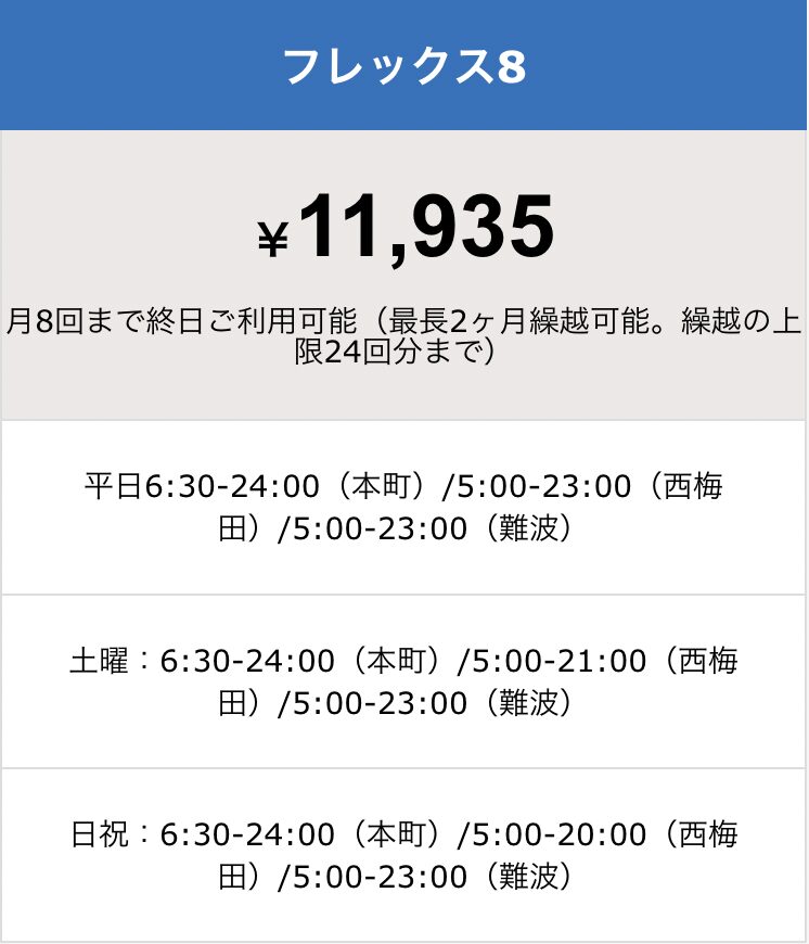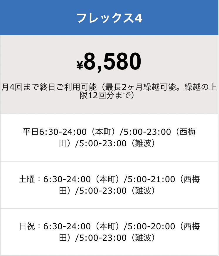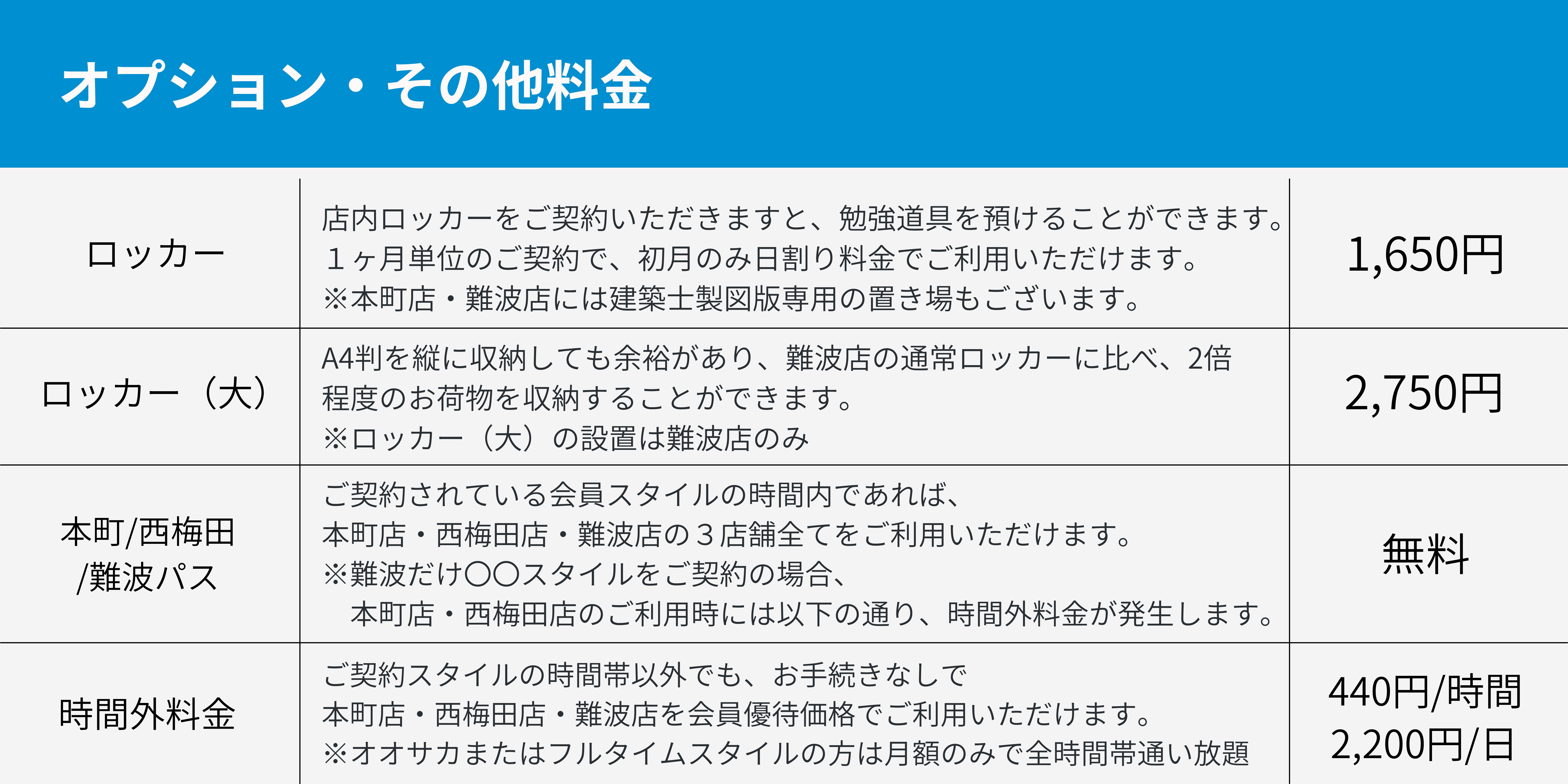 会員登録されると西梅田店と本町店と難波店の全ての店舗をお選びいただいた会員スタイル時間内、無料利用いただけます。
