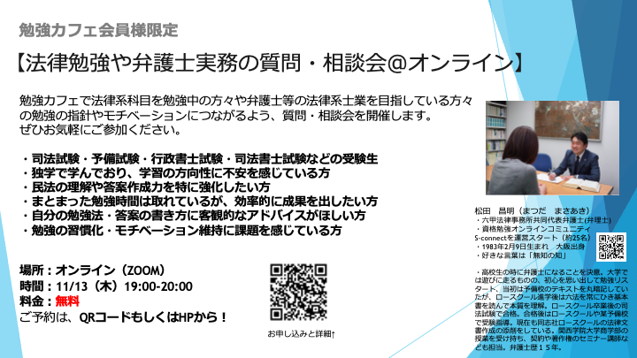 11/13(木)【勉強カフェ会員様向け法律勉強や弁護士実務の質問・相談会@オンライン】