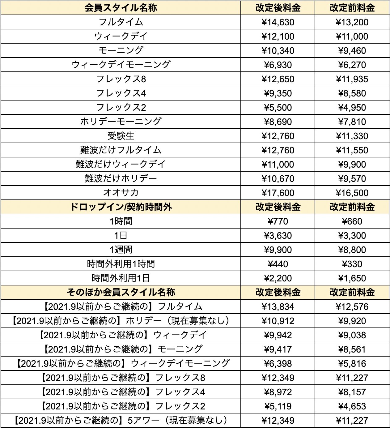 勉強カフェ天王寺寺田町、勉強カフェ東大阪瓢箪山スタジオについては価格改定はございません。